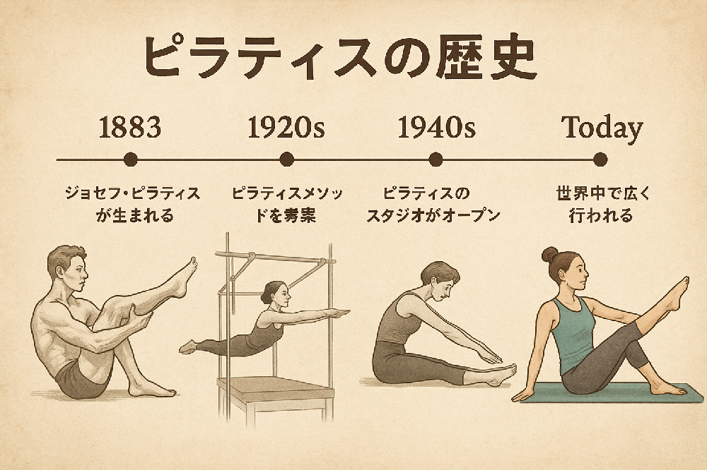 ピラティスは約100年前に生まれ、現在まで発展を遂げてきました。その起源から現代までの主な出来事を、以下の年表形式で振り返ってみましょう。